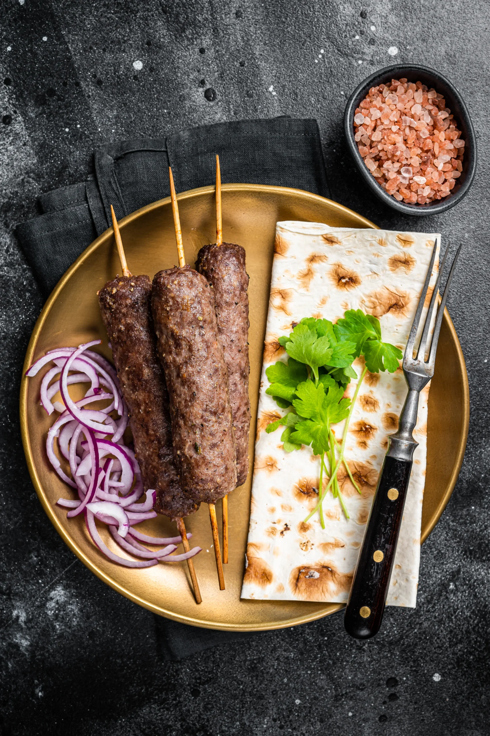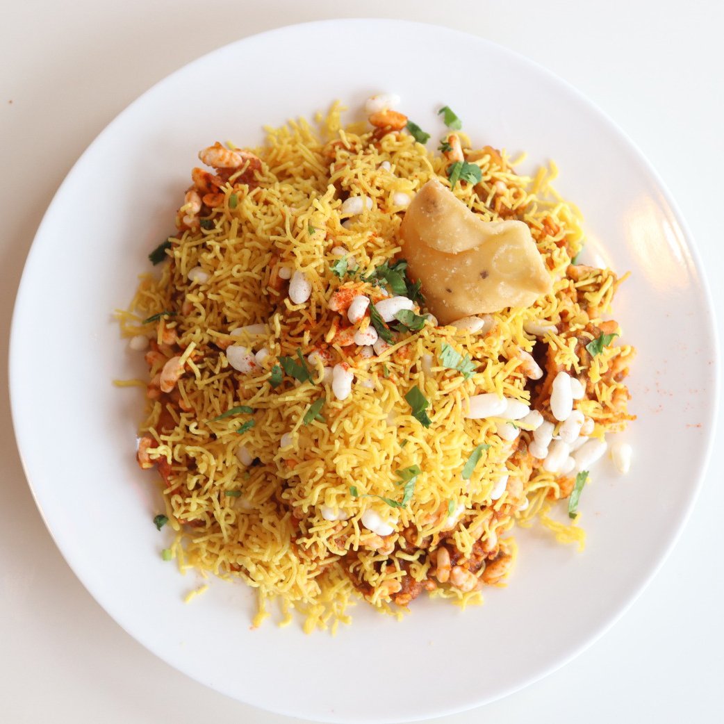 A flattened, pan-seared ground beef patty flavored with pomegranate seeds, green chilies, and crushed coriander.