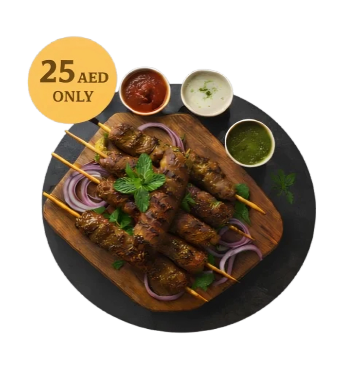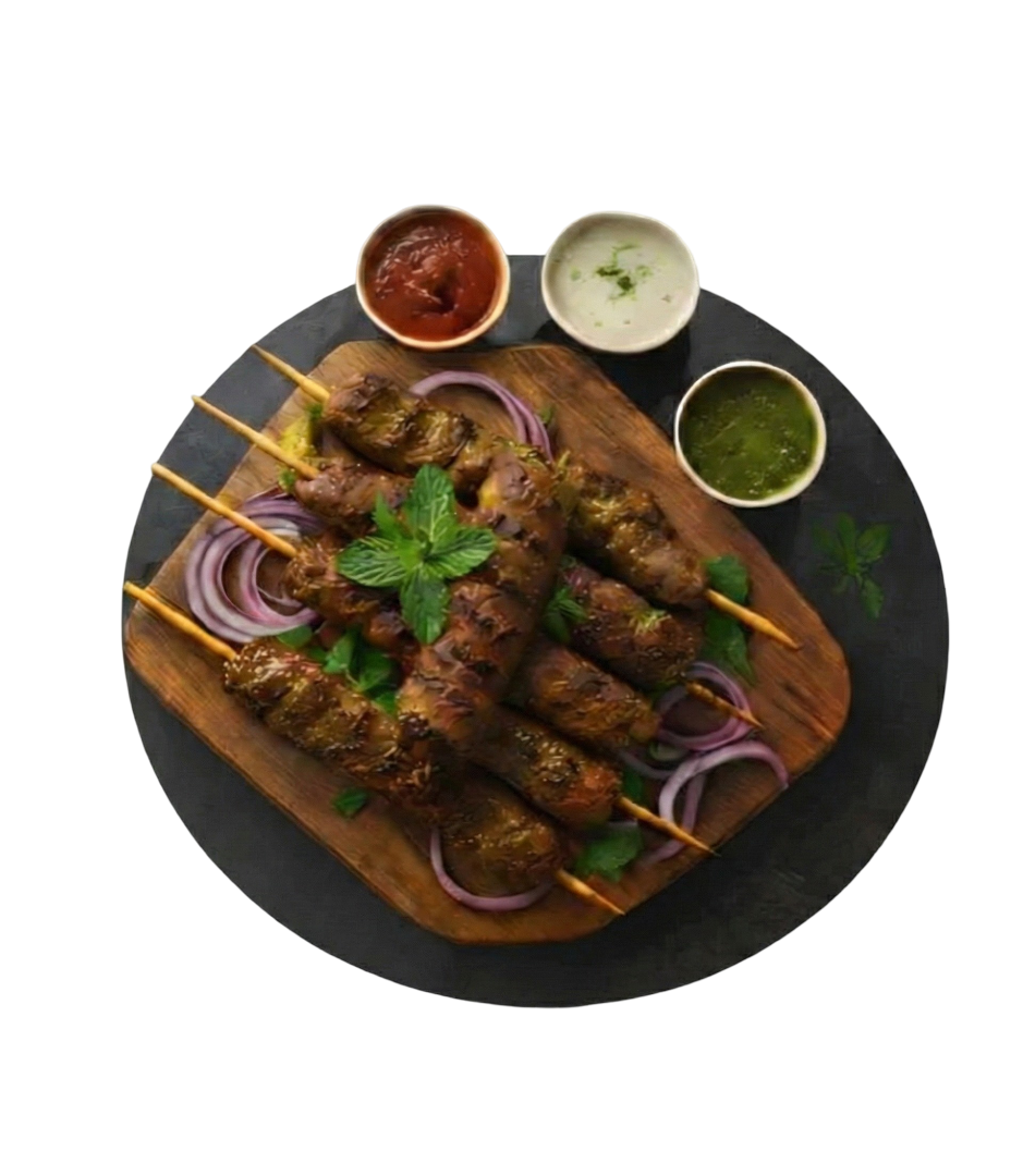 Tender chicken kababs marinated in traditional spices.